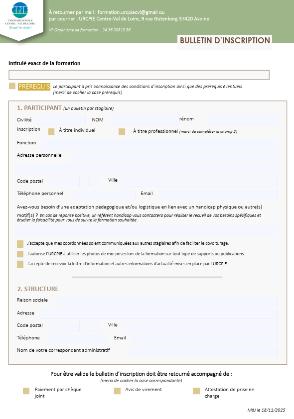 Toute demande d’inscription donne lieu à l’établissement d’une convention de formation, qu’il vous faudra retourner à l’URCPIE Centre-Val de Loire signée et revêtue du cachet de votre entreprise.